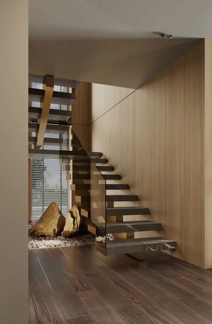 Одним із головних акцентів інтер’єру є лаконічні сходи зі скляними панелями. Їх конструкція базується на центральному косоурі, що додає легкості та просторовості. Скло візуально не заважає проникненню світла, що підкреслює відкритість простору.