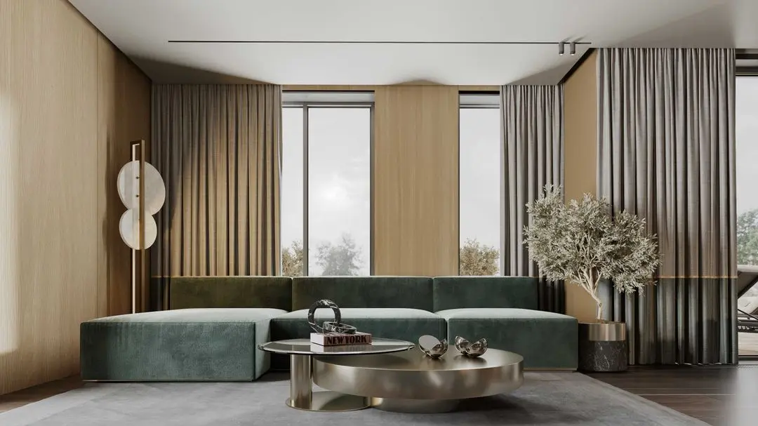 Іншим прикладом є геометричний диван у вітальні. Його чіткі лінії та масивні форми надають простору структурованості, водночас залишаючи відчуття затишку. Завдяки смарагдовому кольору диван стає не тільки функціональним елементом, але й ключовим візуальним акцентом у кімнаті, що привертає увагу та оживляє нейтральну кольорову гаму інтер’єру.