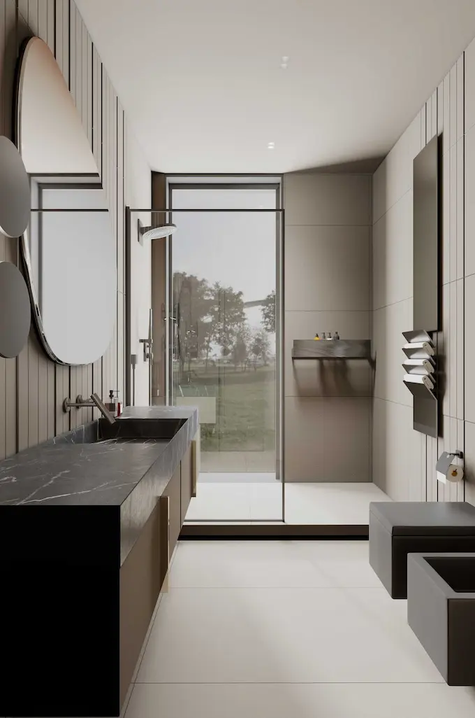Скляні панелі душової зони забезпечують проникнення природного світла, яке наповнює простір, підкреслюючи простоту та відкритість дизайну. Вікно, що виходить на зелений пейзаж, додає інтер’єру природності, створюючи гармонійний зв’язок із навколишнім середовищем. Відсутність зайвих декоративних елементів дозволяє сфокусуватися на текстурі матеріалів та ідеальній організації простору.