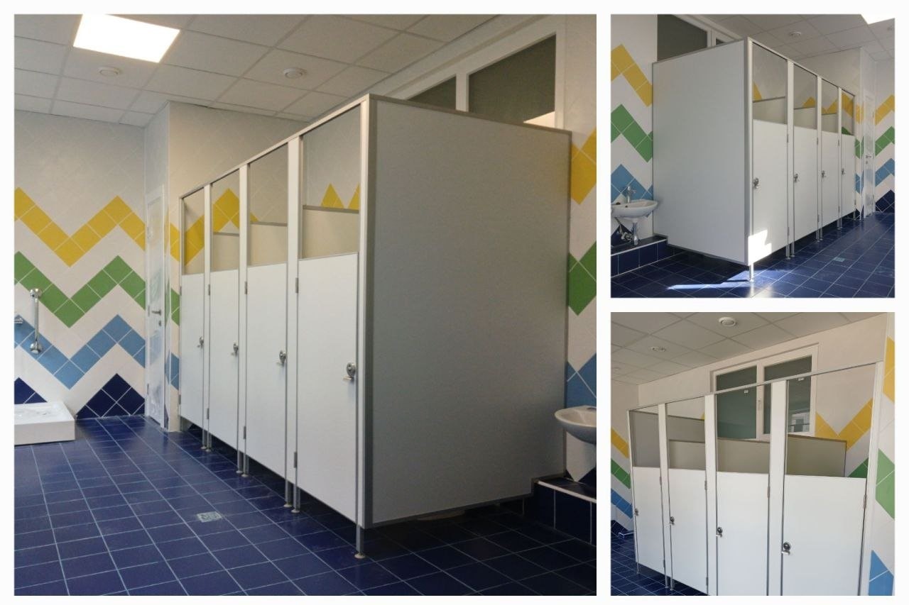 - Перегородки из HPL-пластика: Устойчивы к влаге, механическим повреждениям и химическим веществам, идеальны для мест с высокой проходимостью.